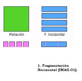 Es una relación que corresponde a una tabla, consiste en dividirla en fragmentos menores, cada fragmento se guarda en sitio diferente, tiene como objetivo buscar alternativas para dividir una las tablas o instancias en otras más pequeñas. Para ello hay las siguientes alternativas lógicas, como son: La fragmentación se puede realizar por tuplas individuales (fragmentación horizontal), por atributos individuales fragmentación vertical) o una combinación de ambas (fragmentación híbrida).