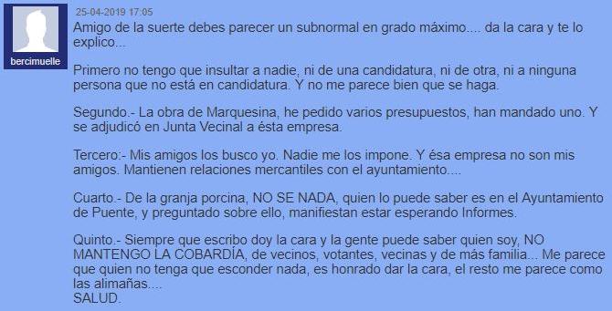 LA GENTE DE BERCIMUELLE, tenemos varias cosas importantes que resolver entre otras lo del tema de la Granja, pero cada uno a su bola, unos pensamos en trabajar para mejorar la vida de nuestro pueblo, otros en fiesta, y las dos cosas son posibles y compatibles, y cada uno hacer lo que mejor le parezca y pueda. Pero no puede llevar MENOS DESDE EL ANONIMATO, a insultar de forma directa o indirecta a nadie. Aunque quien esto lea, será lo suficientemente inteligente para diferenciarlo y calificar a quien lo hace desde la ocultación. Las personas normales "dan la cara".