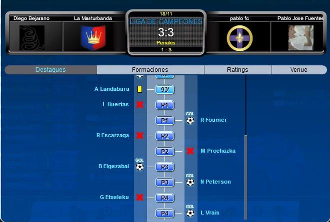 Mi pregunta es enfocada, xq como todos sabemos hay jugadores que vienen con "habilidades especiales" lo que uno supone segun su especialidad es el mejor. Si les dijera que jugue la final de la liga de campeones, que lelgue invicto ganando los 16 partidos, con 37 goles a favor solo 3 en contra y juego con uno ke llego a los ponchazos, dirian soy el candidato a ganarla, es mas yo pensaba eso. Si les dijera ke iba ganando dos a cero y ke en un tiempo me metio tres goles, dirian no podes perder asi. Si les dijera ke empate en el ultimo momento, no podria tener mejor suerte. Si voy a penales? es cuestion de suerte... pero perdi la copa por penales. Me olvidaba un detalle los dos primeros en errar tenian la habilidad experto en penales... creer o reventar ?