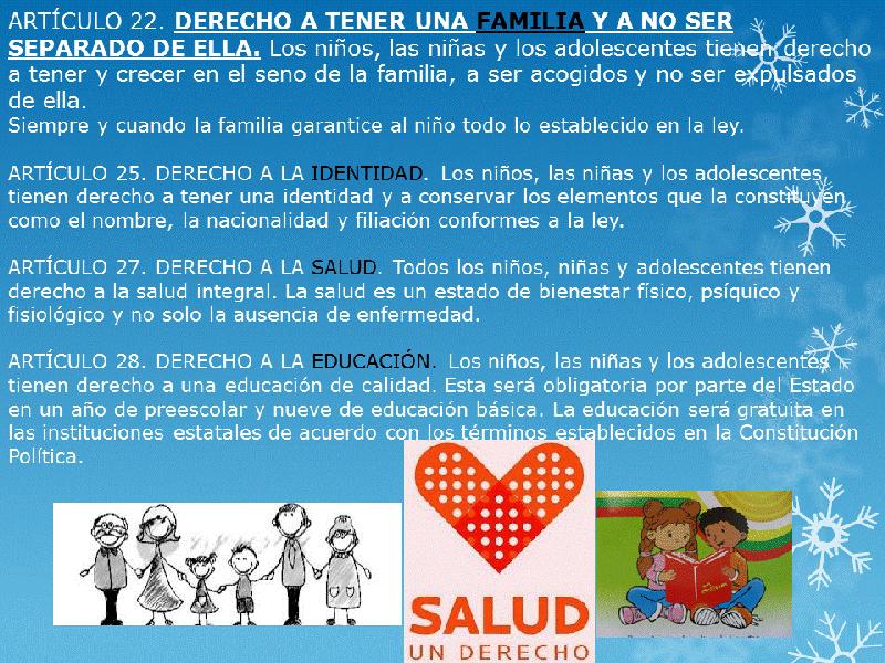 ARTICULO 17: Habla de garantizar al niño su calidad de vida, teniendo en cuenta que debe de estar en un ambiente lleno de amor, respeto cuidado y que cumpla con sus necesidades básicas para un mejor desarrollo y evolución sabiendo que esto es trabajo de los padres y el gobierno. ARTICULO 18: Habla sobre el derecho a la protección de los niños contra el abuso, violencia , maltrato físico y psicológico por parte de familiares, o personas ajenas a este. ARTICULO 20: Los niños y niñas no deben estar expuestos a explotación sexual ni económica tampoco deben ser abandonados bajo ninguna circunstancia por esto la persona que este a su cargo debe de promover y ayudar a la protección de el menor. ARTICULO 21: Habla sobre el derecho a la libertad, los niños no pueden ser detenidos ni privados de su libertad. ARTICULO 22: Nos habla del derecho a tener una familia y a no ser separado de esta, para así tener un mejor desarrollo. ARTICULO 25: Derecho a la identidad, los niños deben ser inscritos en el registro civil de nacimiento y preservar su lengua y cultura de origen. ARTICULO 27: Derecho a la salud, ninguna entidad prestadora de servicios de salud puede negarse a atender un niño o menor de edad. ARTICULO 28: Derecho a la educación, es una acción obligatoria por parte del estado, donde sera un año de preescolar y nueve de educación básica en donde la educación debe ser de calidad y gratuita en las instituciones estatales. ARTICULO 30: Habla del derecho a la recreación y participación en la vida cultural y artística y así mejorar su desarrollo psicomotriz. ARTICULO 31: Derecho a la participación en las diferentes actividades en la familia, la sociedad, institución, programas estatales, departamentales, distritales y municipales que sean de su interés. ARTICULO 33: todo niño tiene derecho a la intimidad, serán protegidos de todas las acciones que afecten su integridad, dignidad y su vida privada.