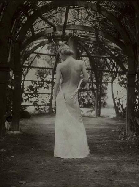 Observé más atentamente esta imagen de mujer. Parecía como si, de pronto, ella adquiriese todo el protagonismo y, en cambio, quedasen velados y en segundo plano los detalles arquitectónicos de la espectacular fotografía. No se le apreciaban las facciones; su figura era un puro gesto: delicado, etéreo, grácil. Su cabello, color de oro viejo, quedaba recogido en una voluminosa coleta sobre la espalda. Un amplio escote circular insinuaba un torso que sería admirablemente hermoso (la imprecisión de la fotografía imponía como penitencia el deber de imaginarlo.) Los pies, descalzos sobre el blanco pavimento, se flexionaban buscando la abstinencia de su contacto con lo terrenal: buscaban la elevación, no por holgazanes que rechazasen el trabajo de sostener aquel peso, liviano por lo demás, sino en una aspiración gozosa de búsqueda de la materia de la que provenían, la nube.