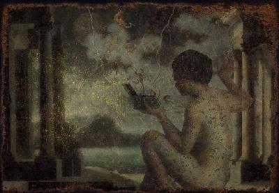 Eva-Pandora, abriendo la caja de los gozos y los dolores antes de ser expulsada del Paraíso. Todos los signos del Zodíaco, en promiscua intimidad, salen de su encierro y vuelan libres para marcar el destino de los hombres, sus tragedias y sus goces.
