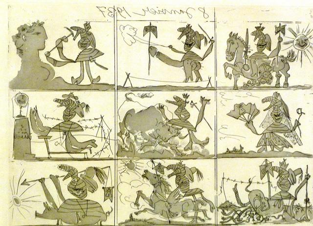 El pintor aragonés, su ectoplasma cazurro y compacto, quedó como absorto ante la obra picassiana. No hacía más que fijarse detenidamente en cada fracción del cuadro. Paseaba lento, demorando cada paso frente a los casi ocho metros de pintura oscura, violenta, desgarrada. Don Eugenio y yo guardábamos un silencio catedralicio, evitando distraer la contemplación del genio.