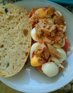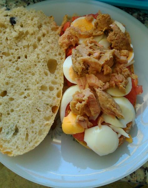 Pero dada mi nueva afición, creo que mejor dejarte un bocata que he hecho con un chapata de olivas negras aromatizado con tomillo, que se comía solo. Lo de dentro pura gula, señores.