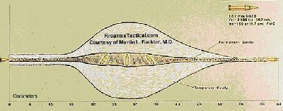 Perfil de herida del proyectil 7,62x51 NATO fabricado en EEUU, mostrando la gran cavidad temporal causada.